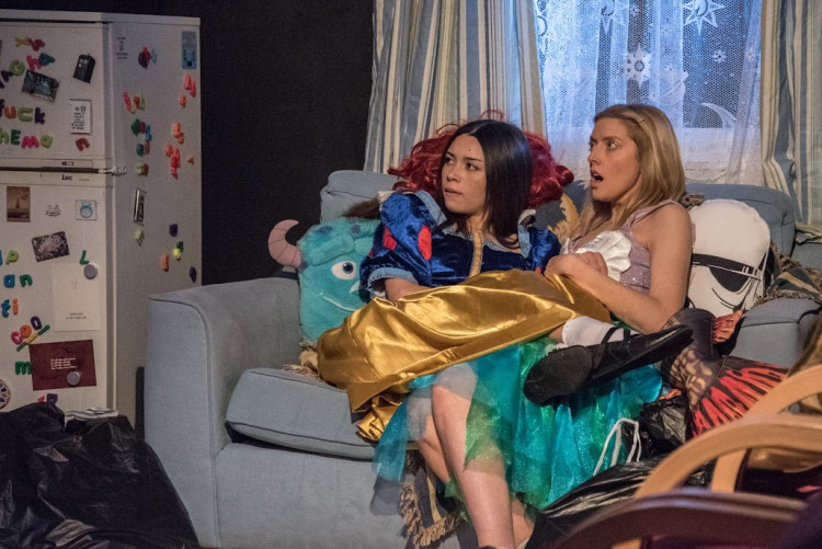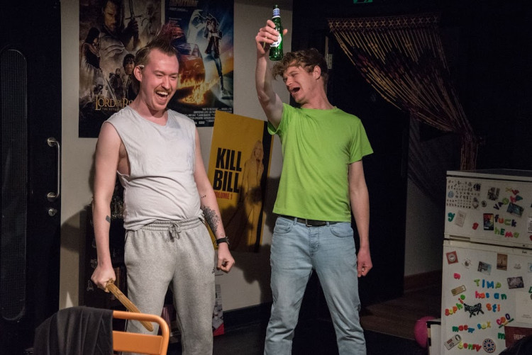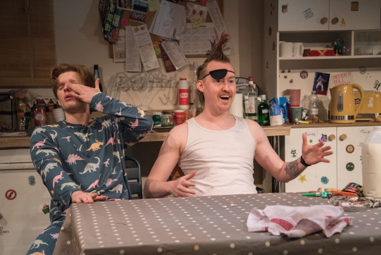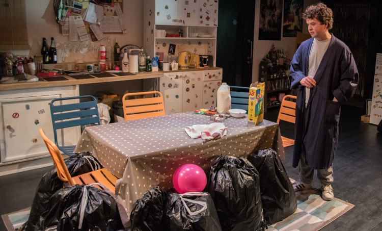 Performed on Hampton Hill's small but intimate Coward stage, TTC's set (which stays the same throughout) is an authentic replication of a classic uni flat kitchen. Consisting of rubbish bags spread across the floor, dirty dishes piling in the sink, balloons, and empty and full alcohol bottles, the set is reminiscent of what my uni flat often looked like the night after a party.
