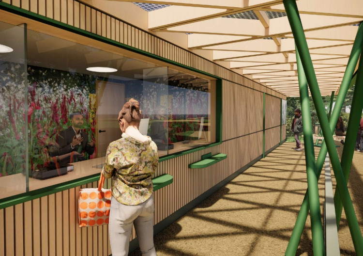 The new building would be set back from the gate to create a more open and welcoming space with better views into the gardens, which would improve visitors' experience of queueing.