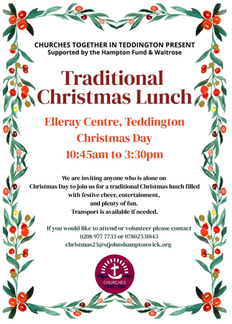 On Christmas Day, Churches Together in Teddington is hosting a traditional Christmas lunch for anyone who is alone on Christmas Day.